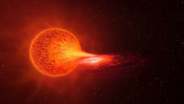 Gas swirls and spirals around the tiny star until it catastrophically implodes. Credit: Melbourne Planetarium (click image for larger version)